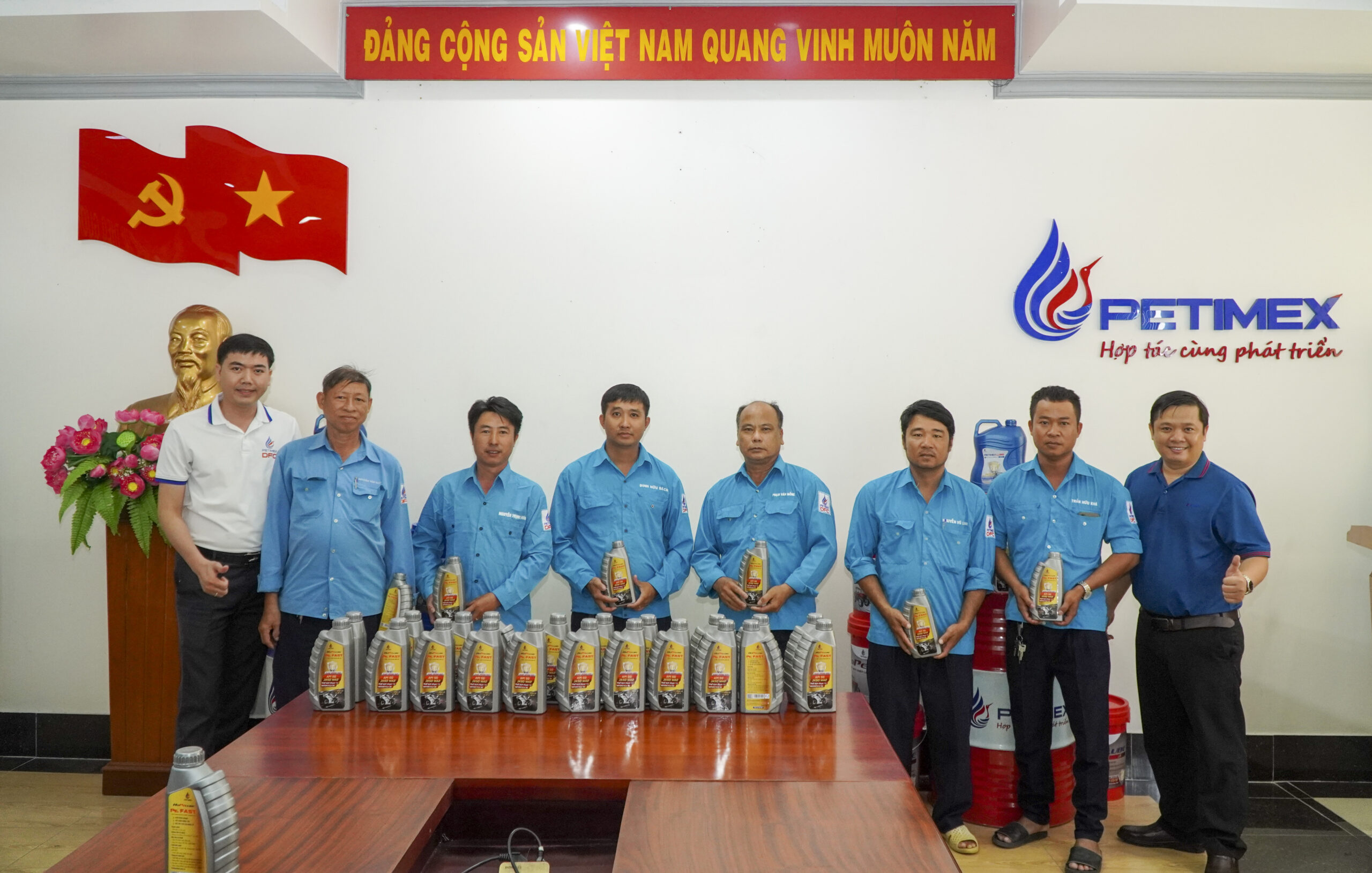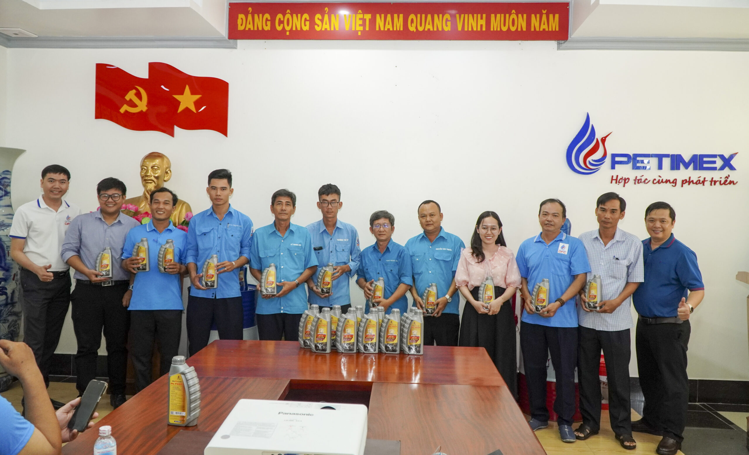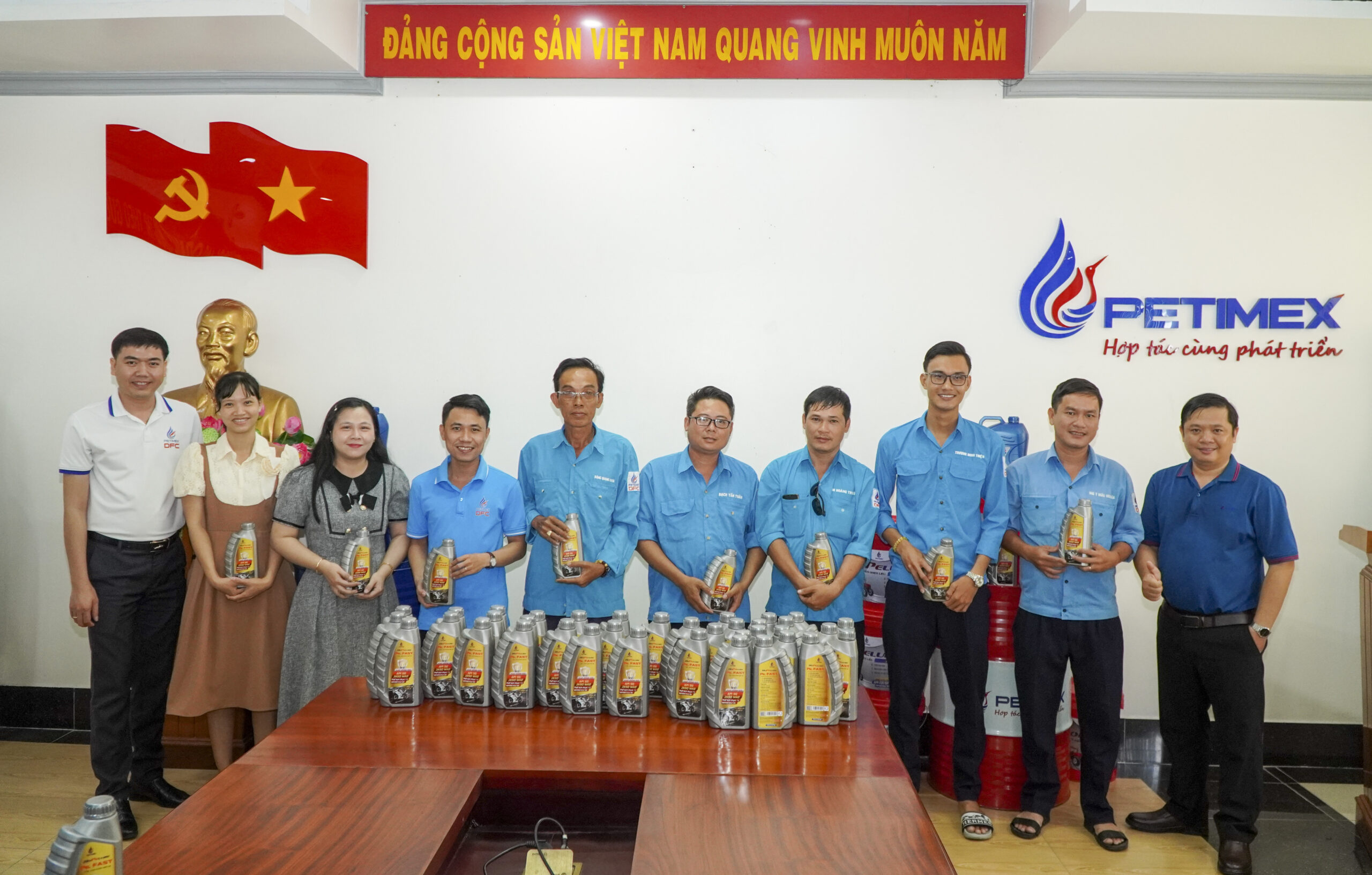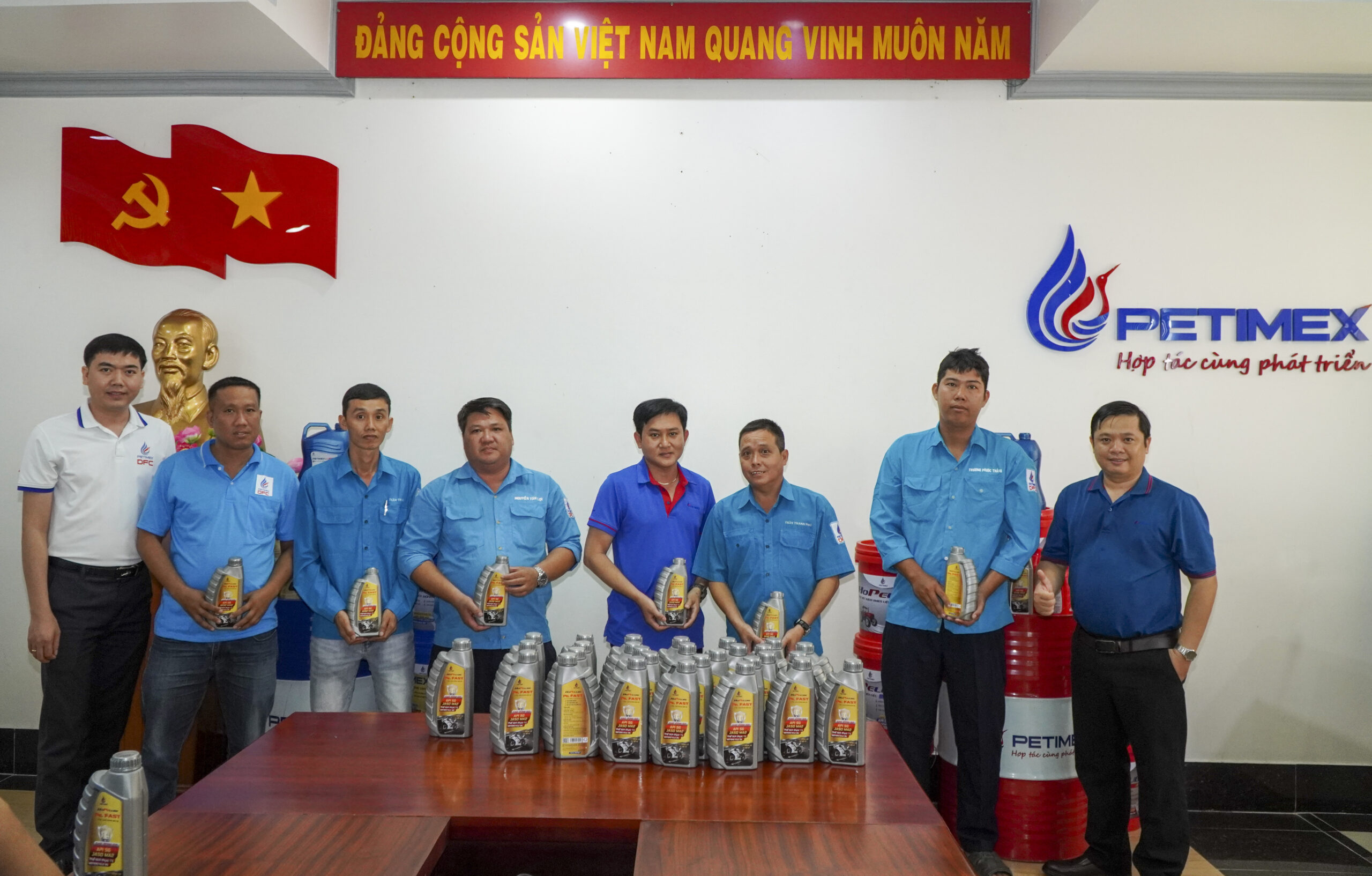 Công đoàn viên Petimex chụp hình lưu niệm tại quầy trưng bài sản phẩm Dầu Nhờn PETIMEXLUBE và HOPELUBE